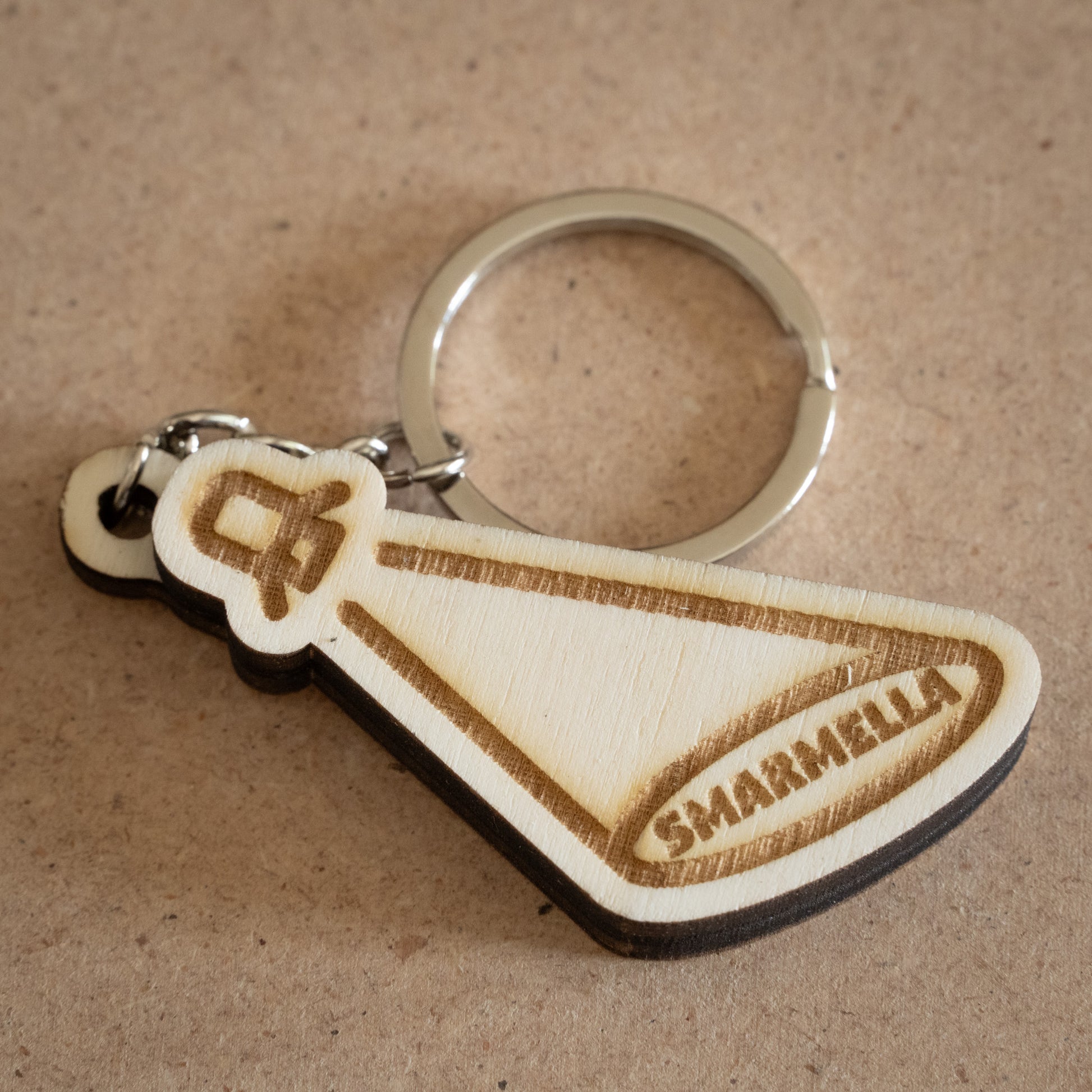 Realizzato con un doppio strato di compensato di pioppo, questo portachiavi unisce la leggerezza del legno alla resistenza di uno spessore da 8 mm. L’incisione laser esalta i dettagli del disegno, rendendo ogni pezzo unico grazie alle venature naturali del legno.